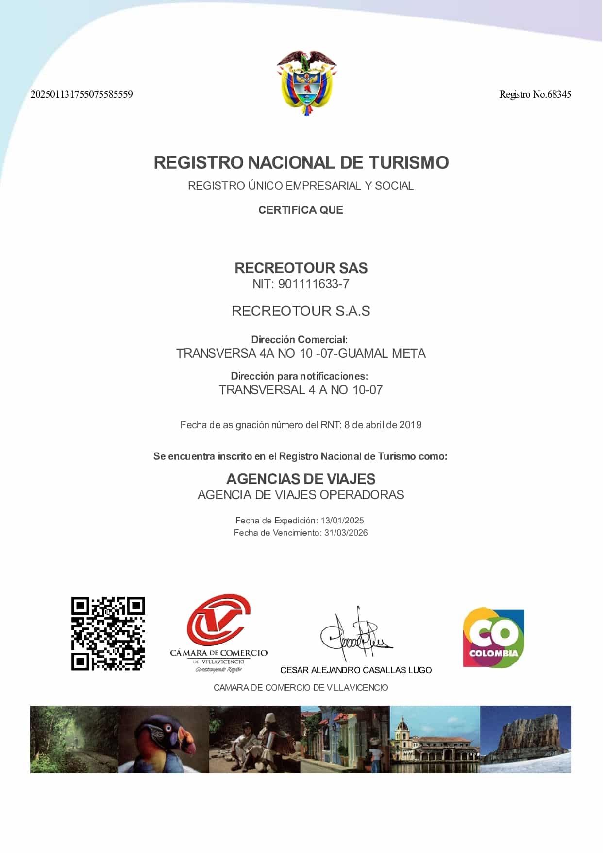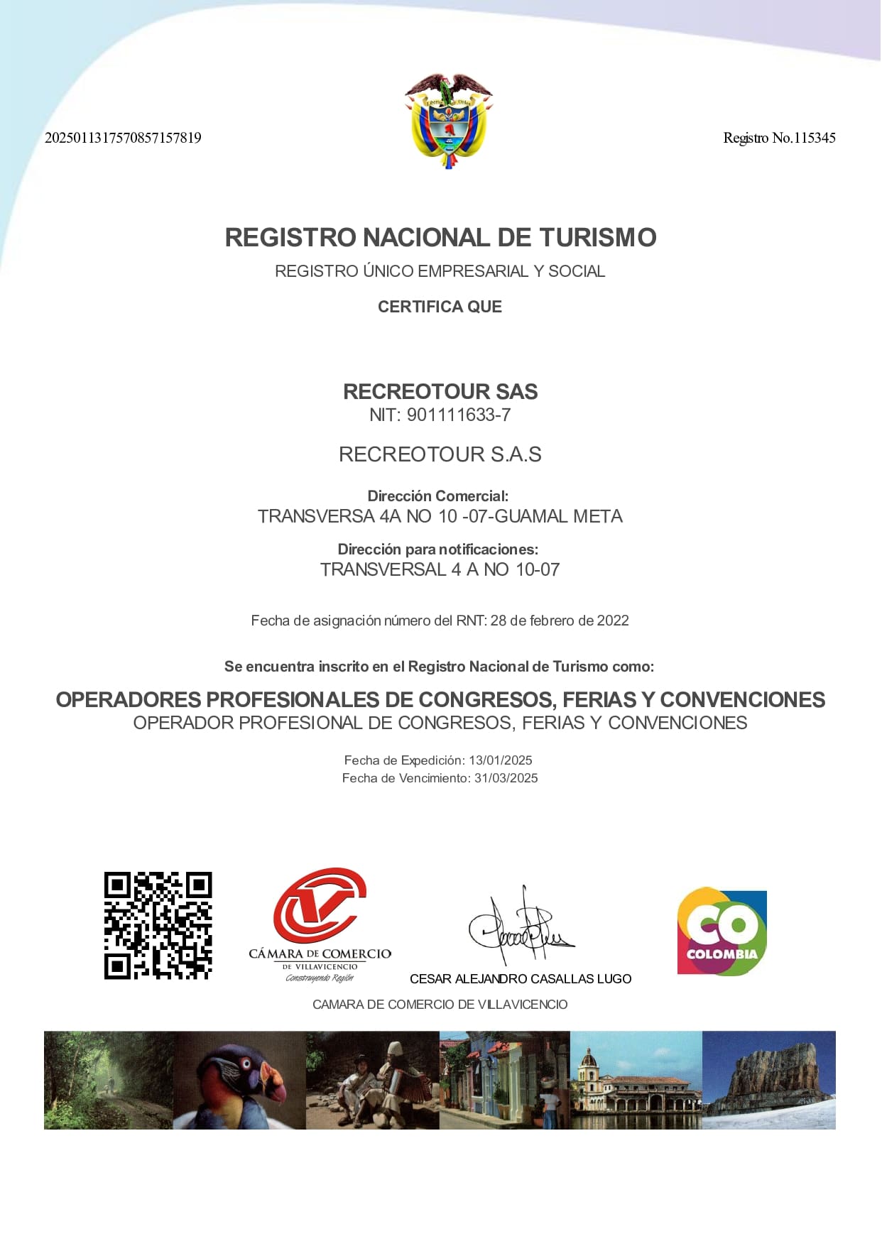 En Recreotour S.A.S. somos un equipo de profesionales apasionados por el turismo, comprometidos con brindar experiencias auténticas y memorables. Nos dedicamos a la operación turística y ofrecemos servicios integrales en áreas como recreación, consultoría, asesoría, investigación, desarrollo y gestión, tanto a nivel nacional como internacional.